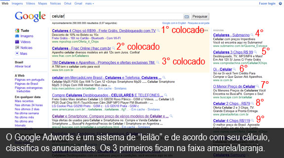 É comum, principalmente no início de uma campanha no Google, os anúncios ficarem posicionados no lado direito da tela de pesquisa. Vale lembrar que o sistema é um leilão. Confira a classificação abaixo:
